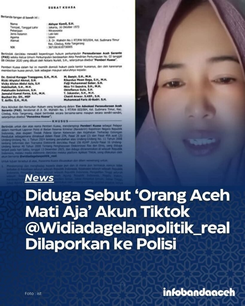 Jurnalpos.id – Akun tiktok /Widiadagelanpolitik_real dilaporkan ke Bareskrim Mabes Polri karena diduga menghina orang Aceh dengan menyebut “tidak tahu diri”, “tidak tahu terima kasih”, “mendingan kalian (orang Aceh) itu mati” dan berbagai ujaran kebencian lain dalam berbagai video pendek yang ia bagikan.