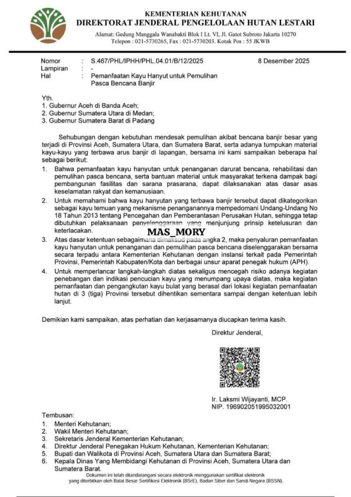 Menindaklanjuti hal tersebut, Kementerian Kehutanan melalui Direktorat Jenderal Pengelolaan Hutan Lestari menerbitkan surat bernomorS.467/PHL/IPHH/PHL.04.01/B/12/2025 tertanggal 8 Desember 2025 yang ditujukan kepada Gubernur Aceh, Gubernur Sumatera Utara dan Gubernur Sumatera Barat.